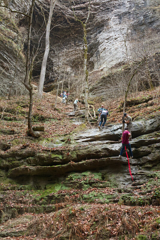 Since I stopped at this point I was able to explore the canyon and the bluffs surrounding the creek. This rugged wilderness is amazingly beautiful. There are waterfalls and caves to explore, and you will observe springs flowing from the rocks along the sides of the creek. At many points along the Indian Creek Trail, the water flows underground beneath your feet, only to emerge as it encounters bedrock. Below is the small waterfall at the point where you begin the climb.