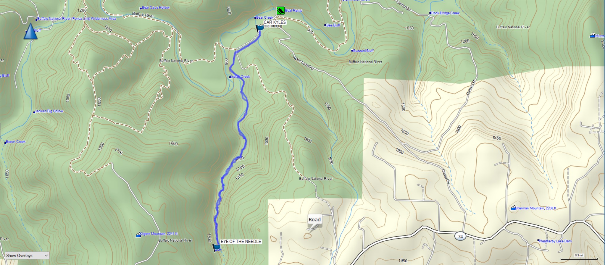I was invited on a group hike to check out the Indian Creek Trail to Eye of the Needle on the Buffalo River on Friday, December 10, 2021. We met at Kyle’s Landing on the Buffalo and gathered our gear for the hike after introductions all around. It was a warm day in December for northern Arkansas, with highs forecast in the lowers 70s and high humidity.