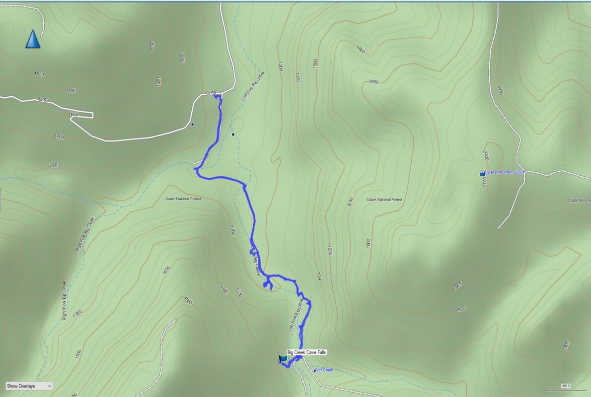 This product is a digital GPS file that contains the coordinates and route information for the Big Creek Cave Falls hiking trail in Arkansas.