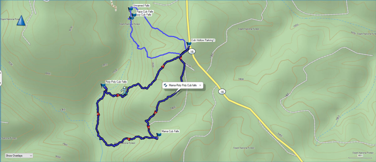 This product is a digital GPS file that contains the coordinates and route information for Mama & Roly-Poly Cub Falls in the Ozark National Forest near the town of Deer in Arkansas.