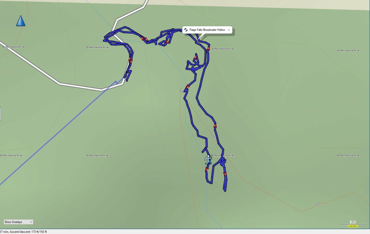 This product is a digital GPS file that contains the coordinates and route information for the Paige Falls Trail in Arkansas.